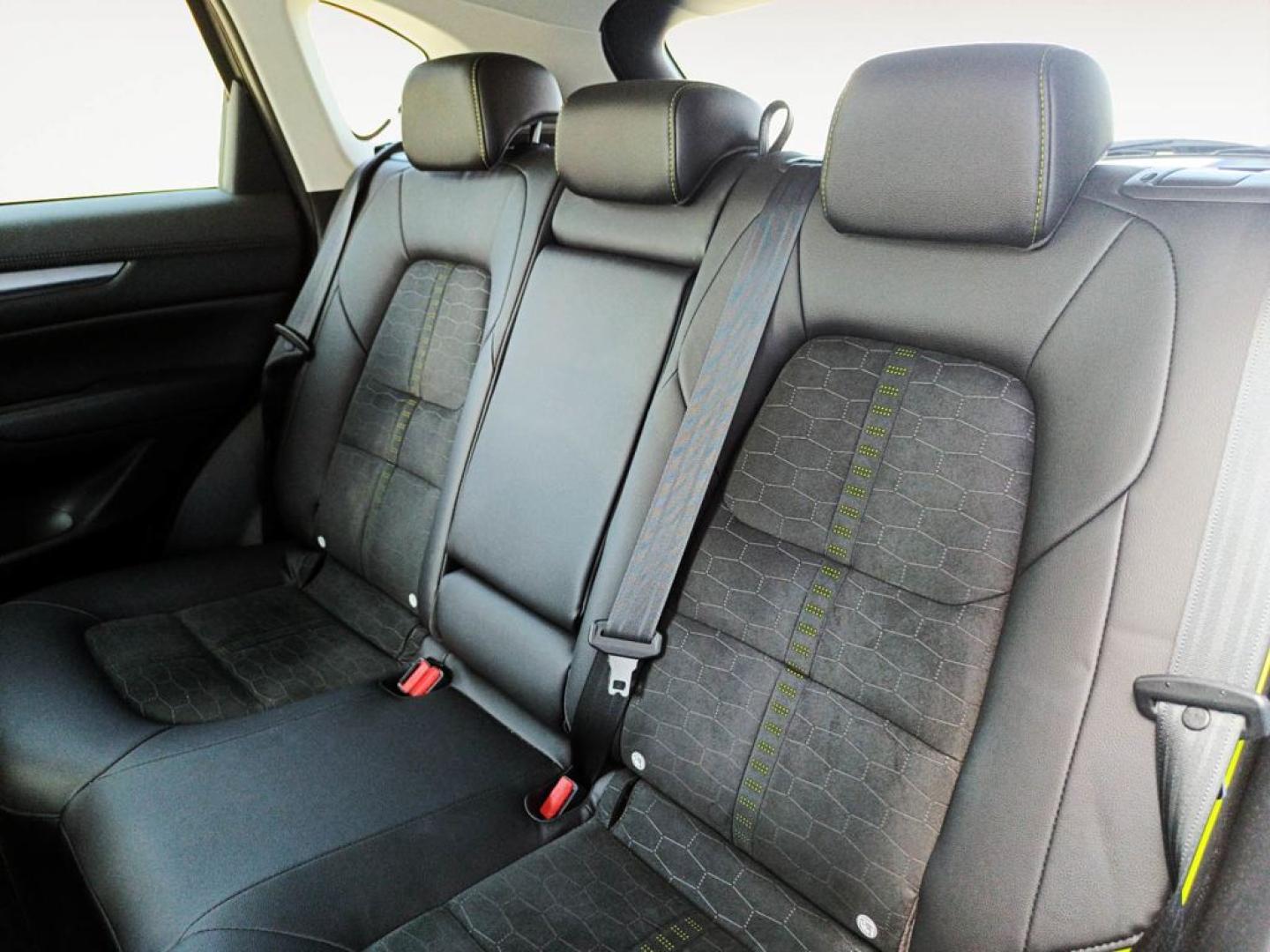 - Asientos de símil cuero y piel vuelta sintética, con costuras en verde lima
